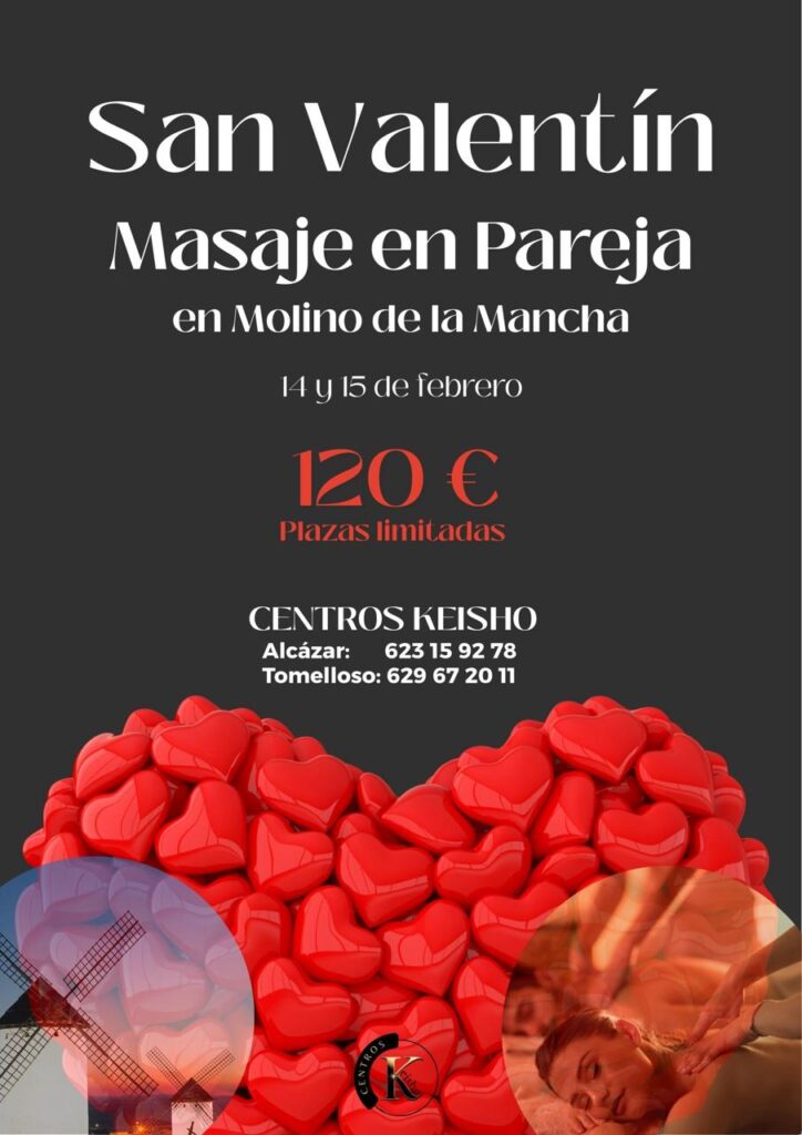 Los días 14 y 15 de febrero, con motivo de San Valentín, Centros Keisho Alcázar y Tomelloso te invitamos a disfrutar de un masaje en pareja dentro de uno de los molinos históricos de Campo de Criptana, un lugar mágico cargado de historia, intimidad y sensaciones.